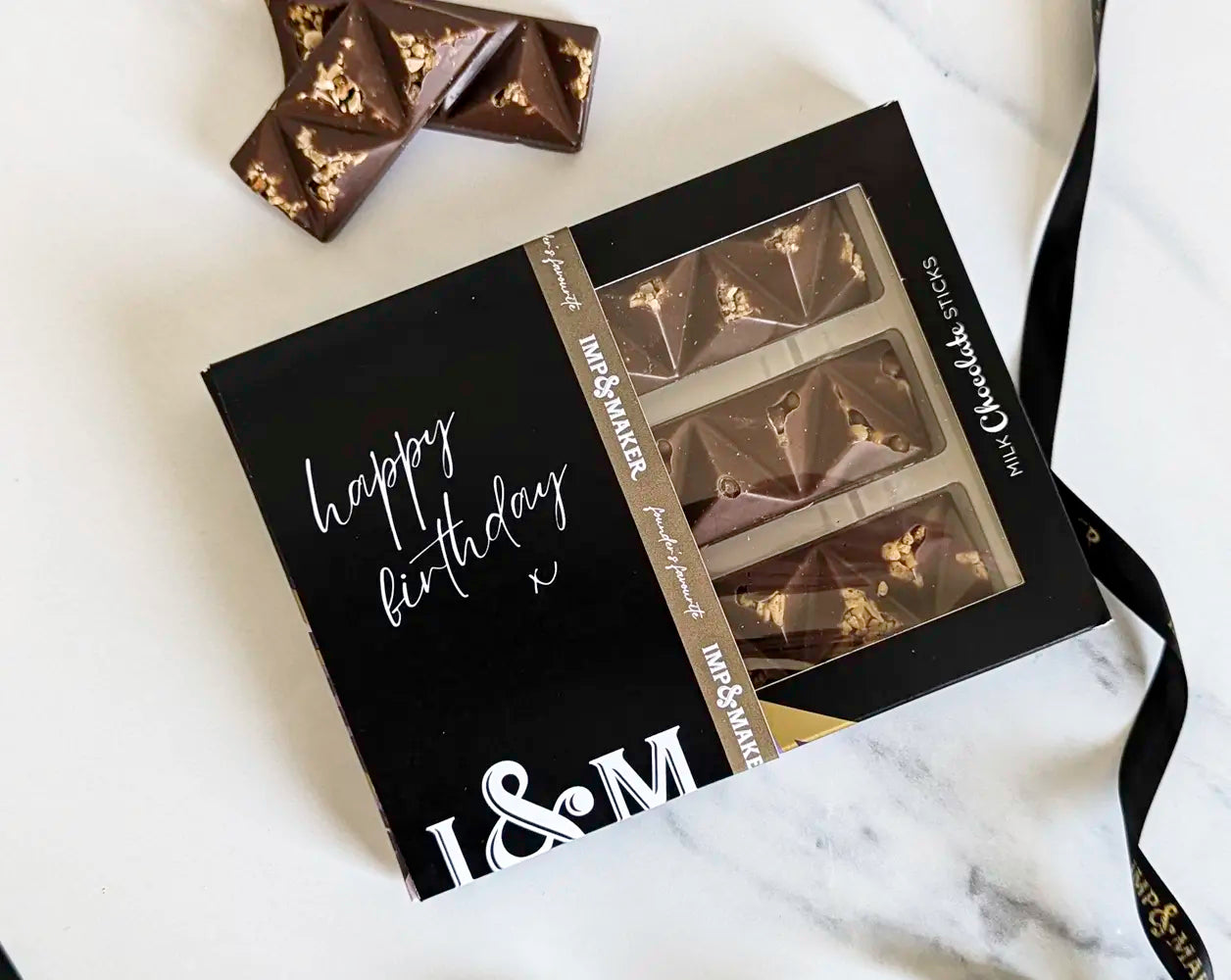 The bundle includes Joe & Seph's Birthday Cake Popcorn, a fun and flavourful treat from one of the UK’s most awarded gourmet makers, alongside a rich Belgian Chocolate & Salted Caramel Truffle Cake from The Original Cake Company. To add extra indulgence, we include our IMP & MAKER Iconic Chocolate Batons, while a large Happy Birthday white and gold wax candle makes the celebration feel even more special, with a stunning glow that sets the scene.
