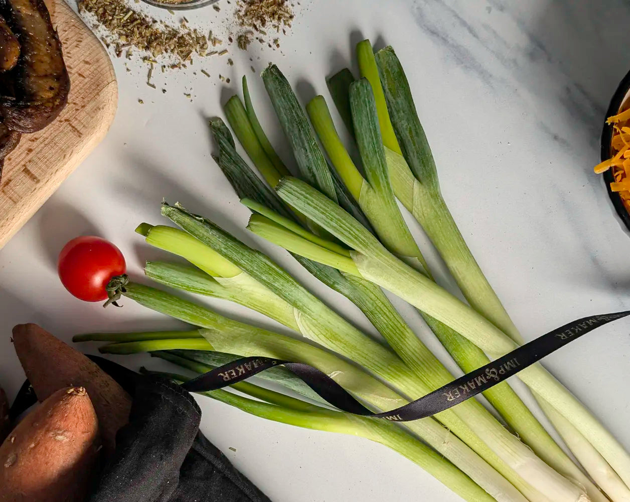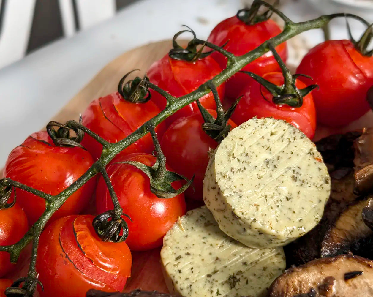 To accompany your steak, the hamper includes potatoes in an IMP & MAKER Cotton Bag, seasoned to perfection with Angus & Oink Fries With That? Seasoning, bursting with rich garlic butter and bacon-inspired notes. Add a layer of melted Lincolnshire Poacher Red Cheese and top with a garnish of fresh spring onions. Complete your plate with cherry vine tomatoes and a crisp mixed leaf salad.